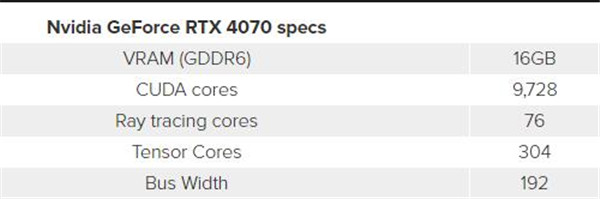 核心方面,RTX 4070基于AD103核心打造,工艺从三星8nm一步升级到台积电5nm。同时,RTX 4070内建多达9728个CUDA核心,304个Tensor单元,76个光追单元,匹配16GB GDDR6显存,位宽192bit,功耗300W。