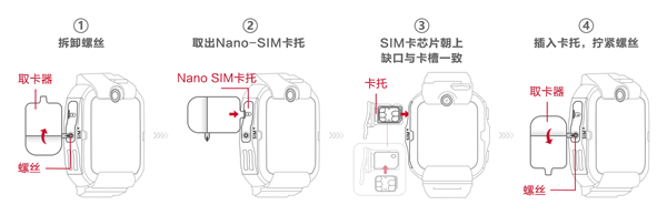 2、将Nano-SIM卡的缺口对准卡托上的缺口,放入卡托里,再插到表体中。注意插紧,以保证防水效果。