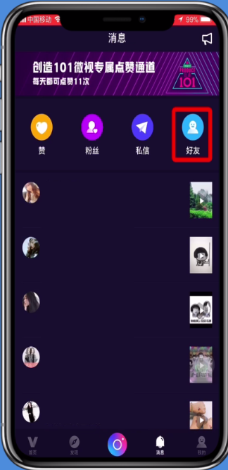 1、打开微视app,点击屏幕下方的【消息】,