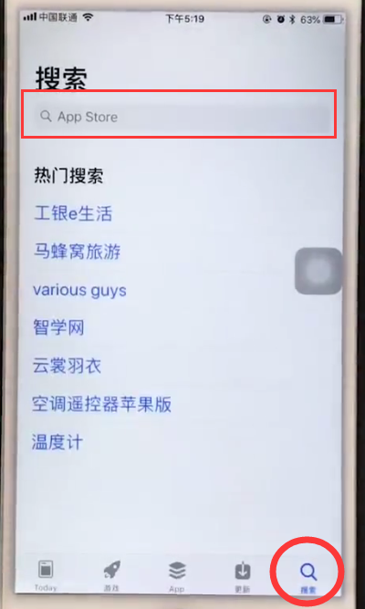 2、点击右下角的【搜索】,进入搜索页面后再点击屏幕上方的搜索栏,