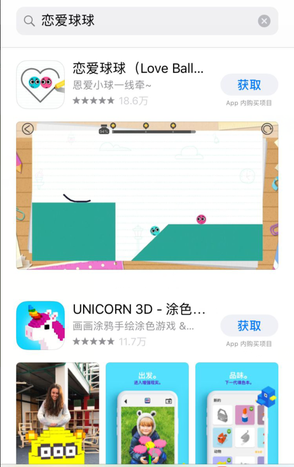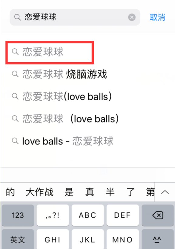 3、在上图界面点击上方的搜索栏,输入想要下载的软件,以“恋爱球球”为例,点击下拉进行搜索,