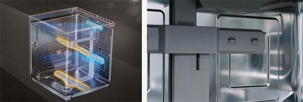 选择加强烘干后,洗碗机的工作时长会增长 1 小时,内腔下层两侧的热烘干风机会带走水分,排出洗碗机外,让内腔保持干燥同时起到高温杀菌的效果。