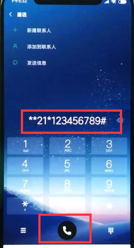 2、拨号输入“**21*+电话号码+#”,再点击下方的拨打即可设置来电转移,