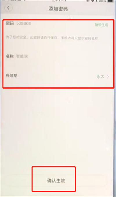 5、选择普通密码或者一次性密码,输入密码,名称,有效期,点击确认生效即可