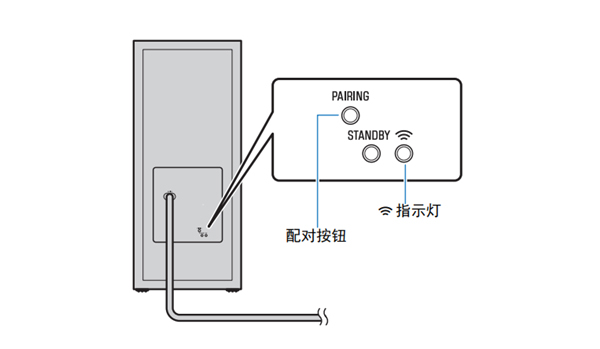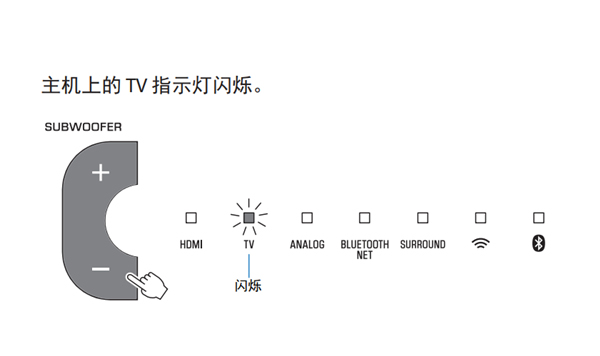 当主机和低音炮已配对,且无线连接已建立时,无线指示灯将亮起,主机和低音炮打开。