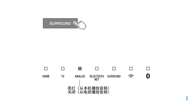 在本机和电视之间切换 HDMI 音频输出,并打开本机电源。指示灯显示 HDMI 音频输出状态几秒钟,然后所有指示灯亮起。