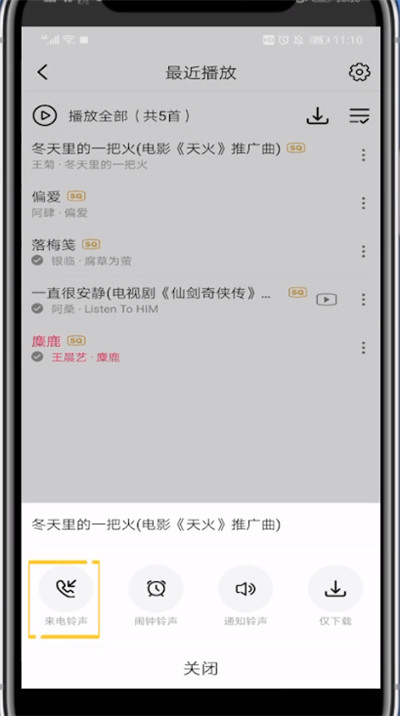 2、找到你想要设置成来电铃声的歌曲,点击歌曲旁的菜单栏