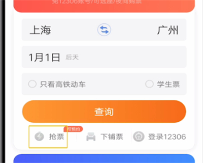 3.输入起点和终点和出行日期,然后点击下方的抢票即可