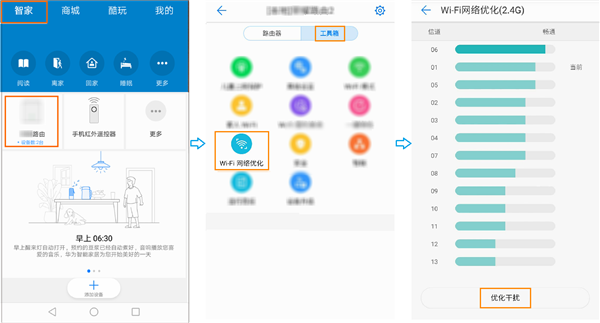 点击工具箱 > Wi-Fi网络优化,点击优化干扰,此时路由器会根据扫描到的信道质量信息,自动选择一个最优的信道进行切换。