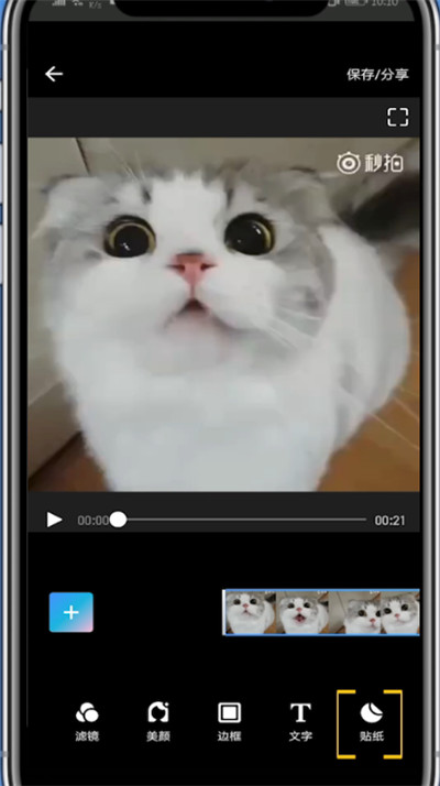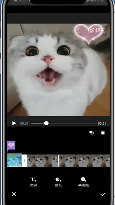 4、选择你喜欢的贴纸调整大小遮挡住水印,然后将贴纸拉满整个视频的时间条即可