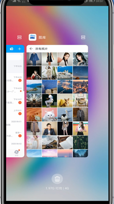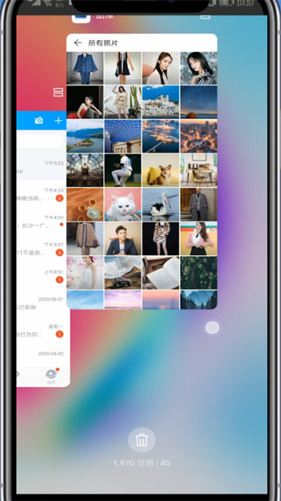 2、手指向上滑动摁住屏幕中间,调出后台应用后将需要删除的应用向上滑出手机屏幕即可