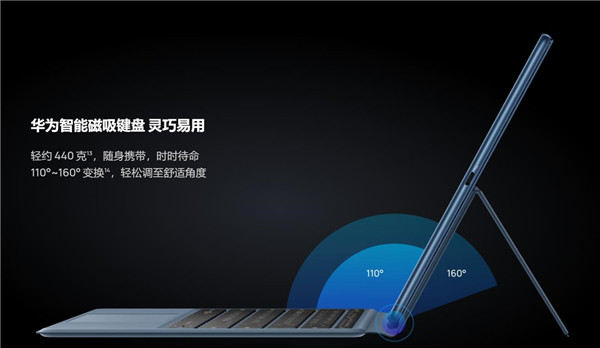 搭配华为智能磁吸键盘可以通过转轴实现110°-160°之间的无级角度调整支撑,最大程度的满足了用户在文档编辑、影音娱乐以及手写笔书写等不同使用场景下的需求,并且在任何角度及使用场景下,键盘均能保持稳定不晃动。
